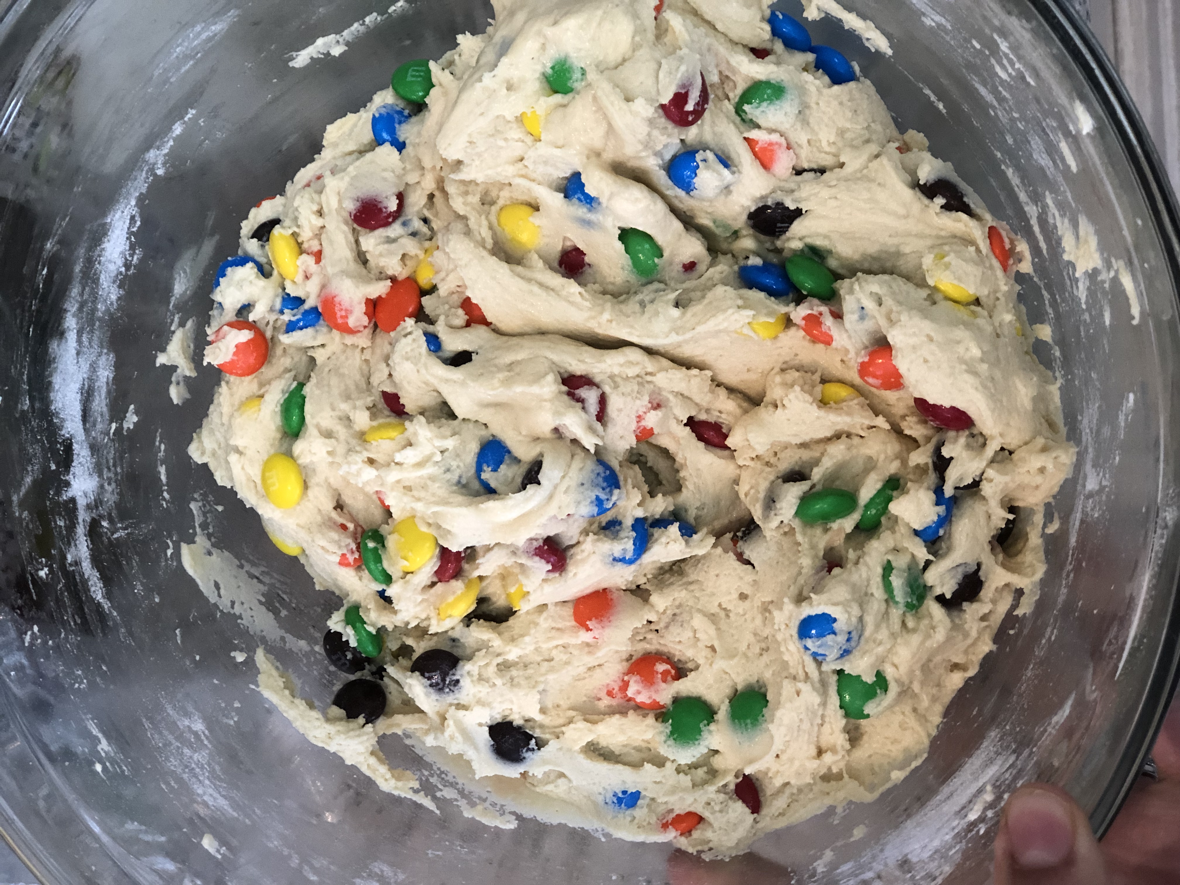 I LOVE these cookies. They are are so chewy and chocolaty and I think the bright colored M&M’s just make me happy. Or maybe its the chocolate…. Anyway I really love making them and the kids do too. I adapted this recipe from an old cook book I have that called for chocolate chips and walnuts and shortening but these are much better. The only thing I find slightly annoying is that you have to refrigerate the dough for 30 min and I am kind of impatient. Don’t skip this step though (believe me), as my Dad always says “patience is a virtue”.